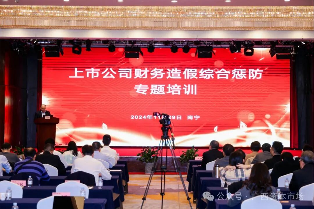 为深入贯彻落实党的二十届三中全会精神、新“国九条”和资本市场“1+N”政策要求,深化对资本市场财务造假综合惩防政策解读,强化上市公司“关键少数”群体的合规意识,共同推进广西上市公司规范运营、高质量发展。11月29日,广西上市公司协会(以下简称“协会”)在广西证监局的指导下,通过“线上+线下”的形式举办上市公司财务造假综合惩防专题培训会议,并取得良好的效果。广西证监局领导出席会议并作讲话,广西辖区上市公司董事长、总经理、董事会秘书及财务总监等共计80余人参加现场培训会,线上培训会议共计711人参与。培训会由协会秘书长主持。会议指出,今年6月,国务院办公厅转发中国证监会等六部门《关于进一步做好资本市场财务造假综合惩防工作的意见》(以下简称“意见”),从坚决打击和遏制重点领域财务造假、优化证券监管执法体制机制、加大全方位立体化追责力度、加强部际协调和央地协同、常态化长效化防治财务造假等5个方面,提出了具体而明确的措施要求。作为上市公司的“关键少数”,董监高人员应率先垂范,深入学习资本市场最新政策,不断提升公司风险防控与合规经营能力。一是要强化政治意识,充分认识当前防范打击财务造假的监管决心,清醒认识到监管部门查处财务造假的力度不会变、手段不会软、标准会更高;二是要强化责任意识,切实维护辖区资本市场的诚信基础,知敬畏守底线,讲真话、做真账,不虚构业绩,不欺骗市场,不误导投资者,切实维护辖区资本市场的诚信基础;三是要强化内控意识,全面提升上市公司规范运作水平,主动肩负起提高上市公司质量的主要责任,常怀敬畏之心,做到守法合规、诚实守信、规范治理,共同维护广西上市公司的良好形象。培训环节,授课老师从上市公司信息披露的相关要求入手,全面系统解读了《意见》的内容,结合案例深入浅出讲解分析,进一步提高上市公司“关键少数”的理解和认识,增强底线意识与规则意识,为公司落实财务造假综合惩防工作提供保障。围绕上市公司财务监管的最新动态与监管重点关注的违规情形,通过生动案例剖析,深刻阐述了规范上市公司财务内控制度的重要性,并就企业如何有效防范财务造假,从内部控制体系构建等维度提供了参考策略建议。协会秘书长在会议总结时表示,协会将始终紧跟党中央、国务院对资本市场改革的战略部署,积极响应证监会“1+N”政策体系及广西证监局的监管要求,坚持自律管理与强化服务并重,助力上市公司会员实现更高质量发展。今年,值此协会成立二十周年及第六届理事会收官之际,协会将于年底前完成换届工作,诚挚邀请各会员单位继续给予支持与监督,携手共创协会发展新篇章。本次培训会议的成功举办,不仅为广西上市公司提供了宝贵的政策解读与实务指导,更为推动广西资本市场健康、稳定发展注入了新的活力与动力。